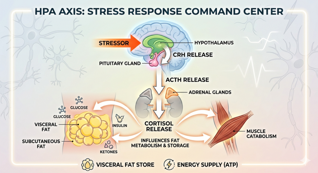 The Hypothalamic-Pituitary-Adrenal (HPA) axis is the command center for your stress response. When triggered, it signals the release of cortisol, which influences fat metabolism and storage.